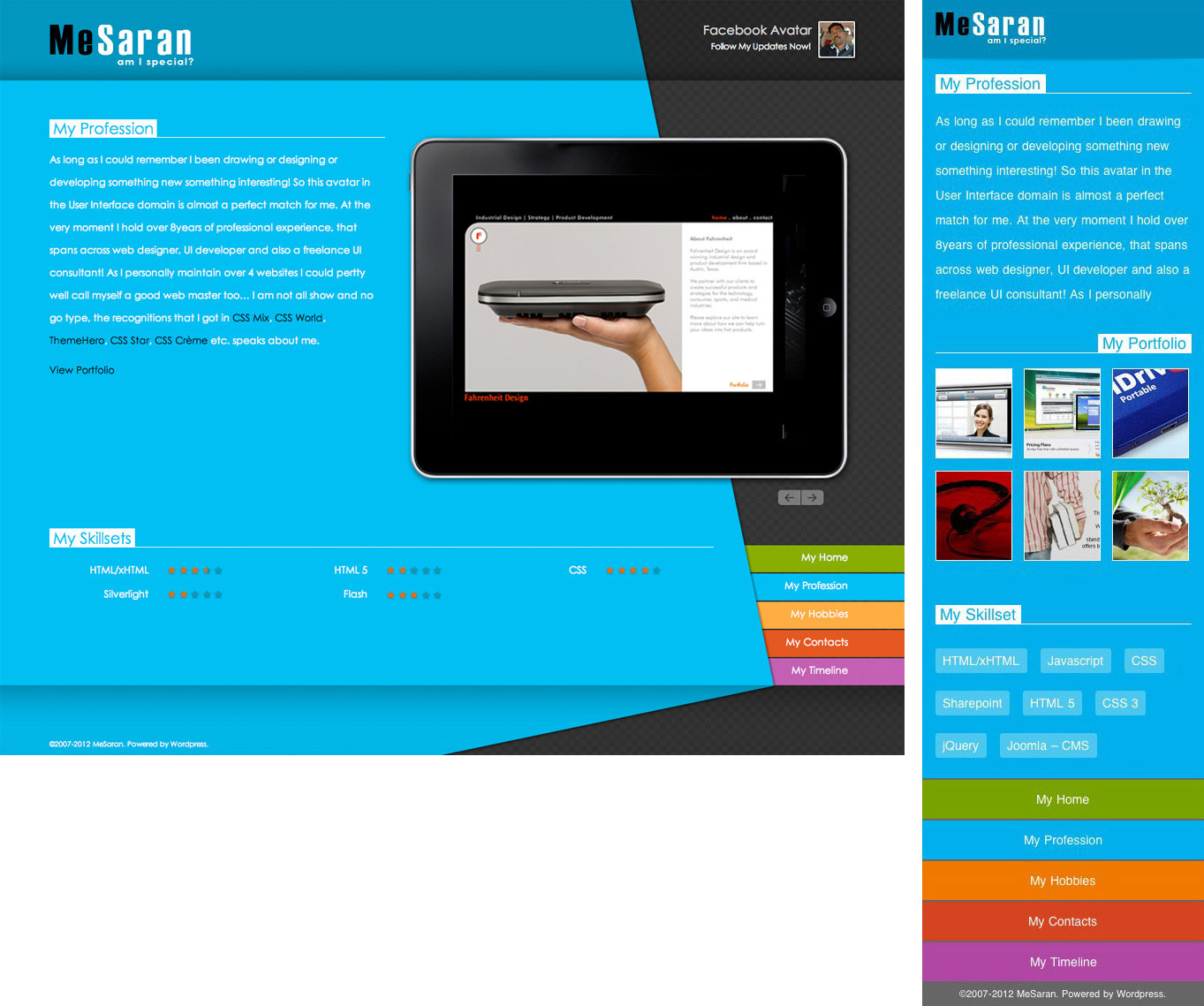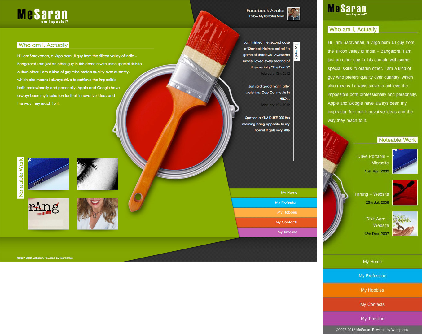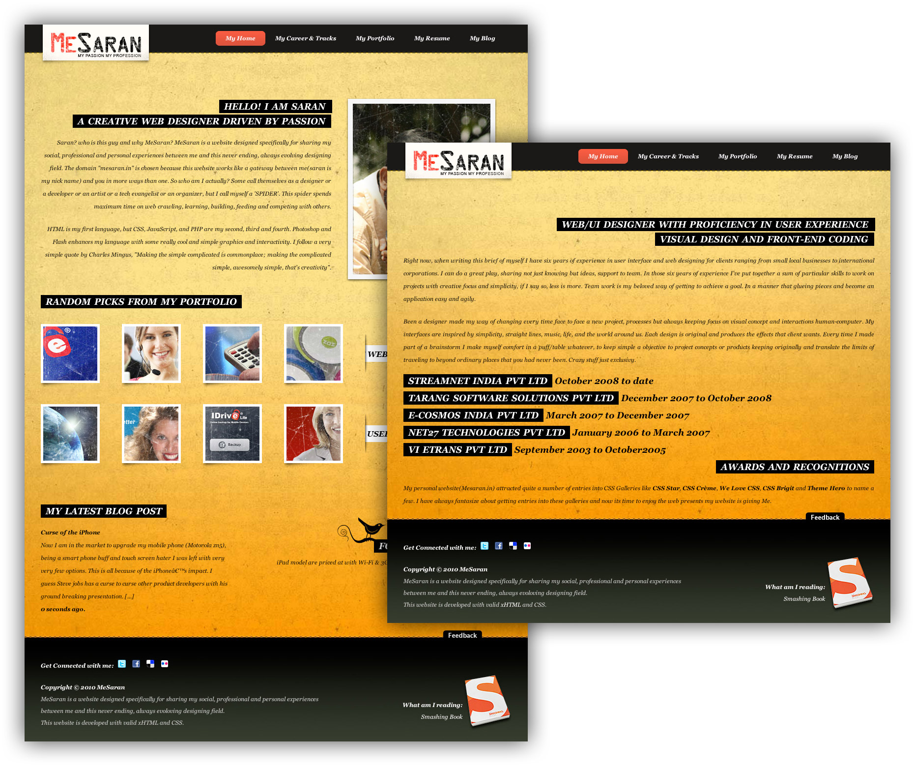 MeSaran.in, a personal website of Saravanan, a Bangalore based UX designer with over a decade of experience in branding, print and digital product design. This website gets sections for featuring his work, his hobbies and contact infromations. Last major update was done around 2007 so a lot can be done to get this upto speed.