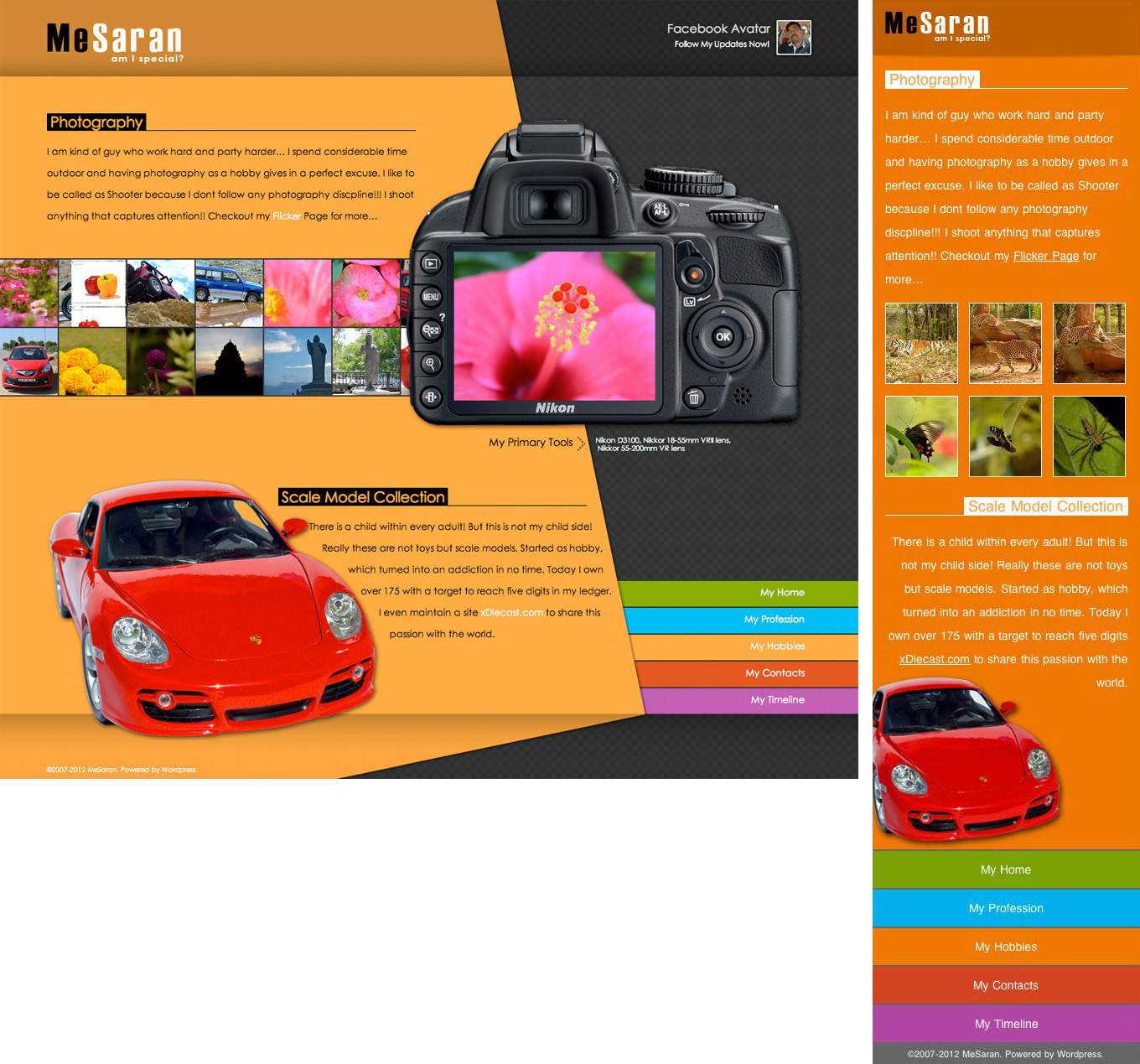To add a bit of personal touch, we added a separate a page to talk about my hobbies. The design language is cheerful so we added a direct feed from Flickr and placed like a film strip, which will become a centre piece of the page along with a DSLR camera. My other hobby of collecting diecast scale models also gets a note, which I wanted show off.