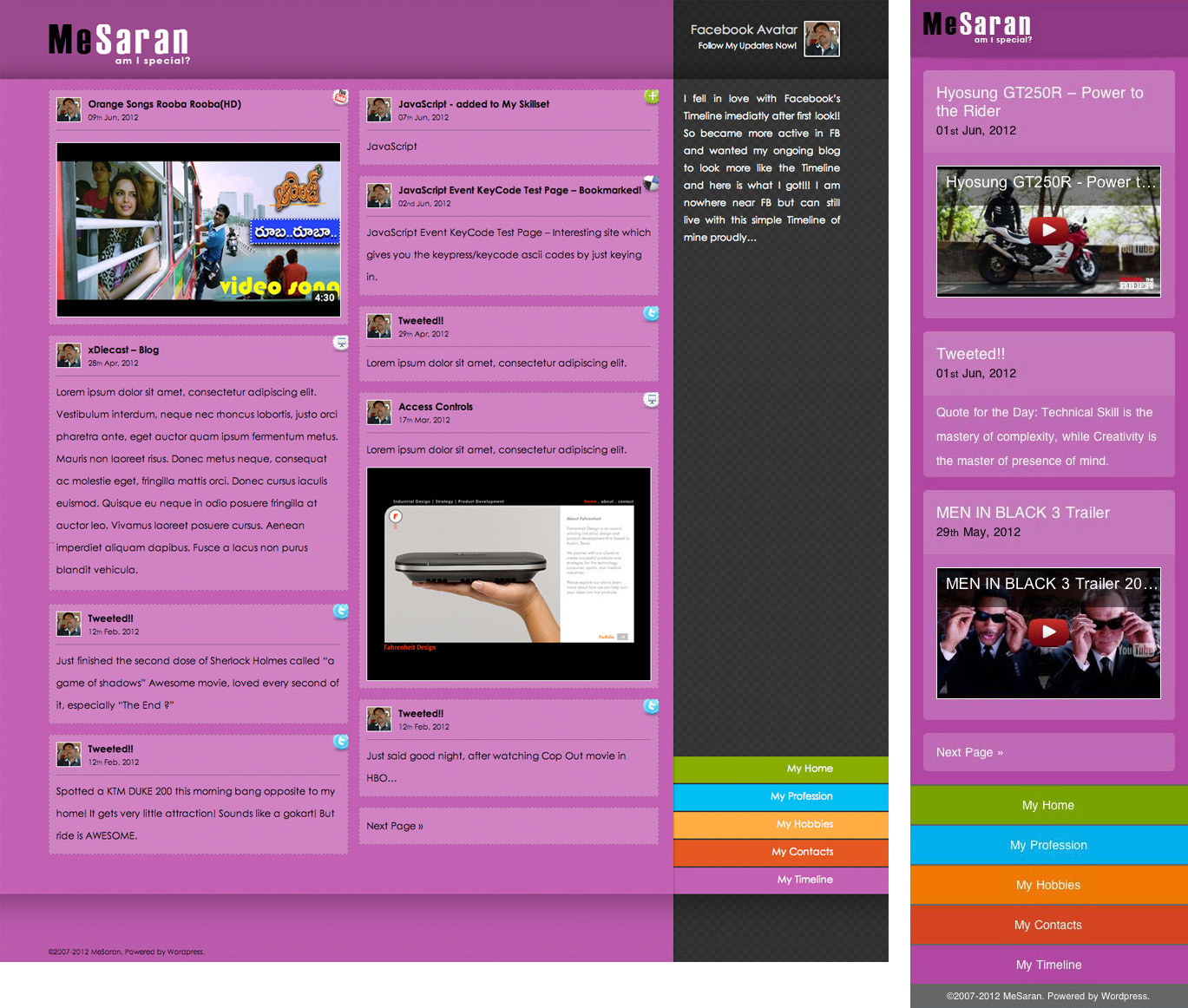 Timeline is basically the blog section from the previous version. But this one is little bit more usable as the backend algorithm is updated to pull feeds from my social handles like “Facebook”, “Twitter”, “Delicious”, “YouTube” and “Flickr” and show along with rest of the blog post living up to its name as “Timeline”.